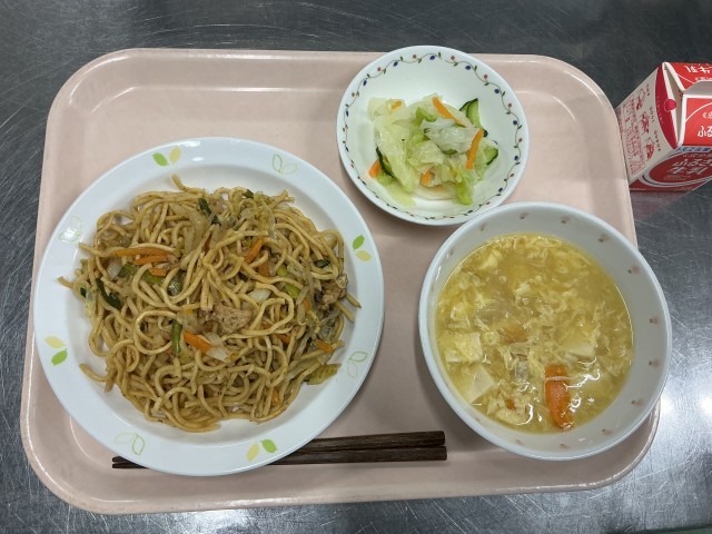 本日の献立 ソース焼きそば 牛乳 野菜の甘酢かけ 中華風コーンスープ