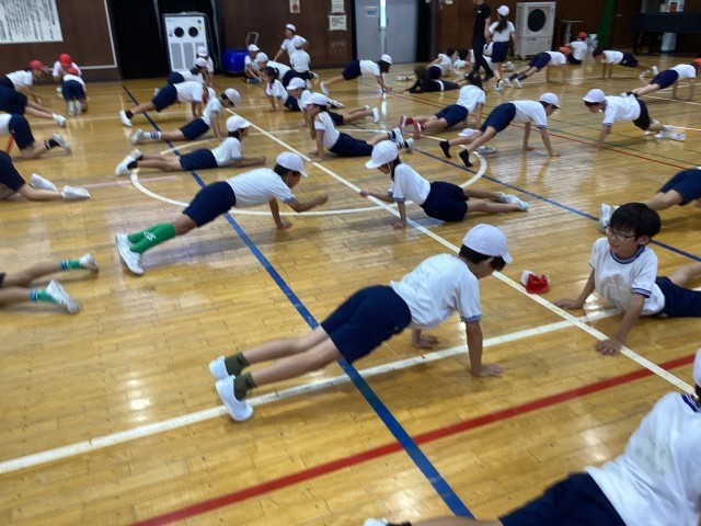 体育では「体つくり運動」を行っています。体つくり運動は、仲間との交流を通して、自分の心と体の状態に気づくことをめあてとしています。力強さや巧みな動きを高める運動に取り組みました。仲間と活動することで、自然と笑顔になり、楽しそうに体を動かしていました。