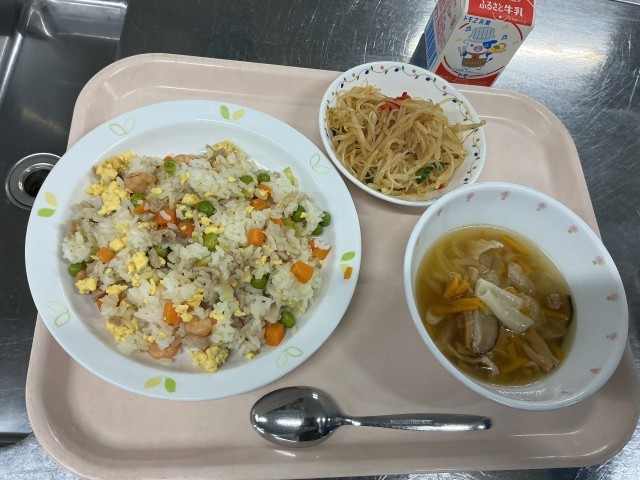 本日の献立 チャーハン 牛乳 もやしのコチュジャンかけ ワンタンスープ