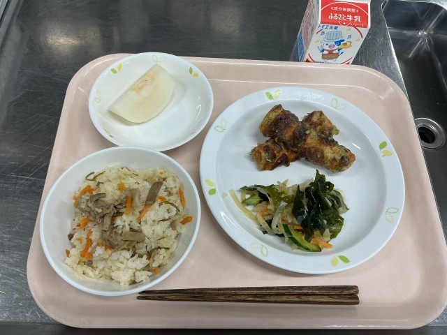 本日の献立 ぶた肉とごぼうのごはん 牛乳 ちくわの磯辺揚げ 大根とわかめのサラダ 梨