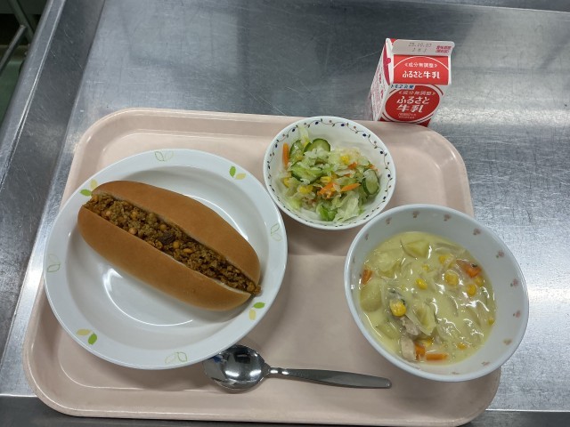 本日の献立 ドライカレーサンド 牛乳 クリームスープ コーン入りフレンチサラダ