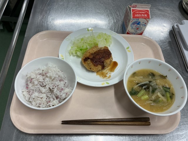 本日の献立 ゆかりごはん 牛乳 コロッケ ゆでキャベツ みそ汁