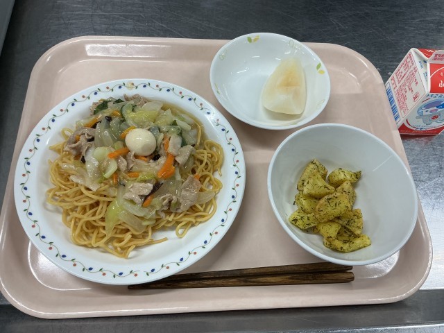 本日の献立 五目あんかけそば 牛乳 フライドポテト 梨