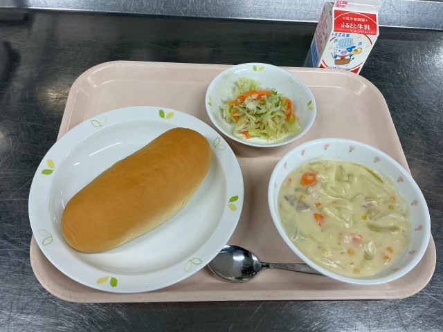 本日の献立 コッペパン 牛乳 クリームシチュー フレンチサラダ