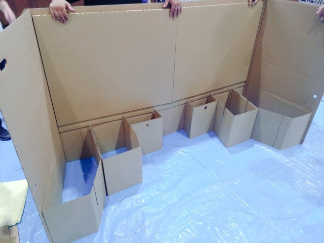 ダンボールベッドを組み立てたり、災害用トイレの使い方を確認したり