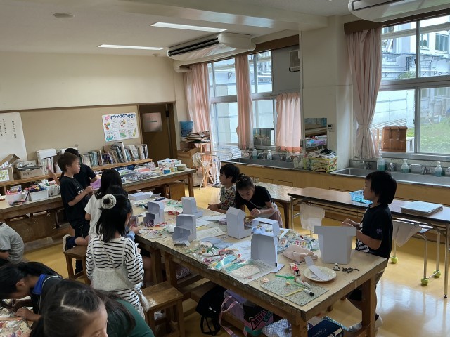 時には色画用紙や毛糸、ビーズなどの材料も組み合わせて自分のお店を作ります。