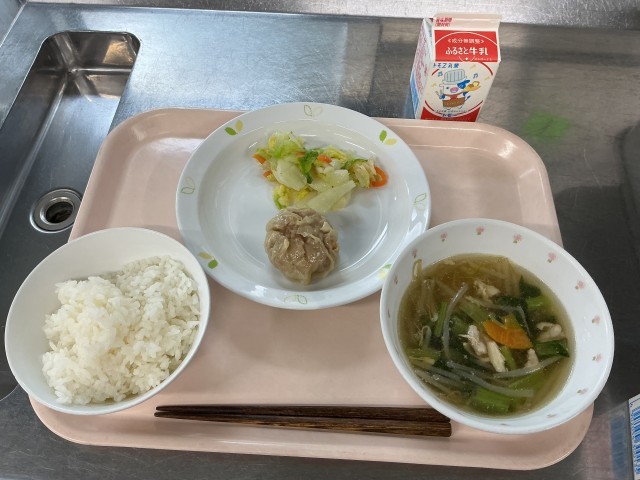 本日の献立 ごはん 牛乳 ジャンボしゅうまい 辣白菜 中華スープ