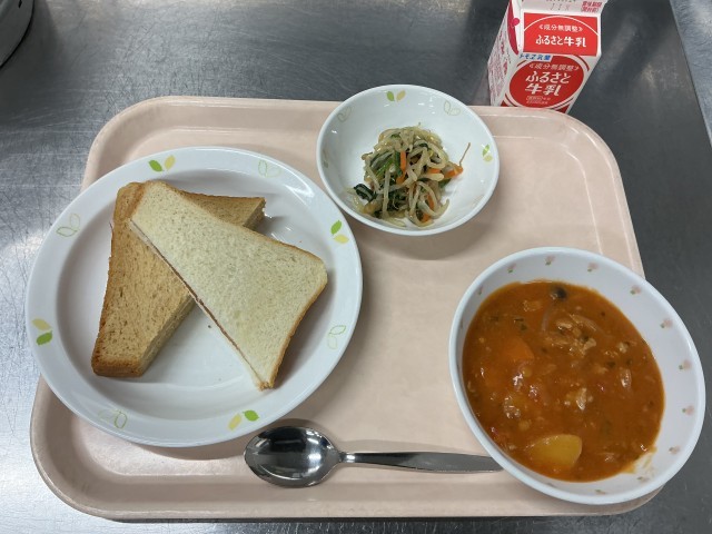本日の献立 二色サンド 牛乳 トマトシチュー ほうれん草サラダ