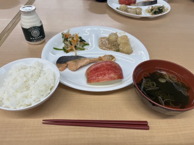 今朝のメニュー → ごはん・焼き魚(鮭)・里芋のそぼろ餡かけ・青菜のおひたし・ネギとわかめのすまし汁・りんご・飲むヨーグルト