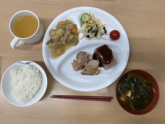今夜のメニュー →   ご飯・鶏の照り焼き・肉じゃが・わかめサラダ・豆腐と青菜の味噌汁・味噌田楽・ミニトマト・川場りんごジュース
