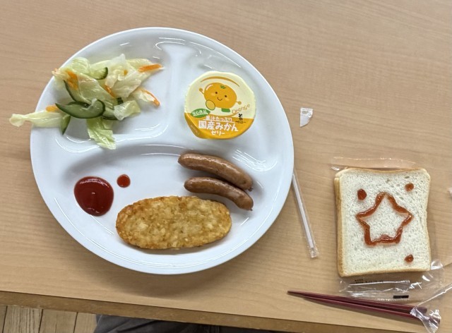 今朝のメニュー → 食パン・いちごジャム・ソーセージ・ハッシュドポテト・ケチャップ・コールスローサラダ・みかんゼリー・牛乳