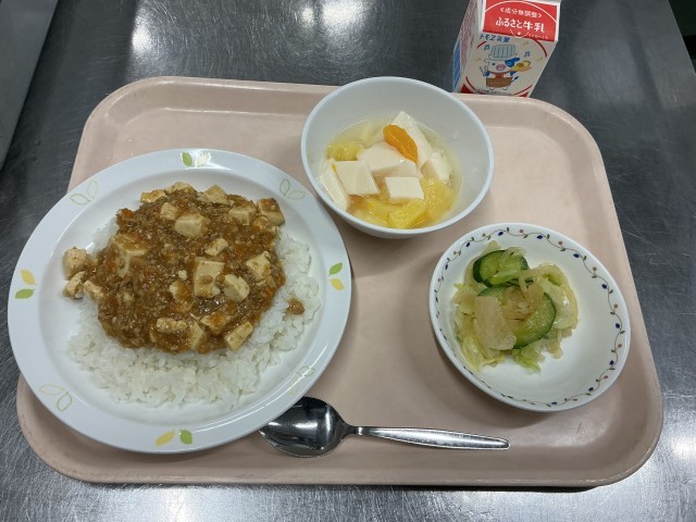 本日の献立 麻婆豆腐丼 牛乳 中華サラダ 杏仁豆腐