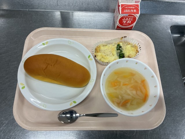 本日の献立 パンプキンパン 牛乳 ポテトクリーム焼き マカロニスープ