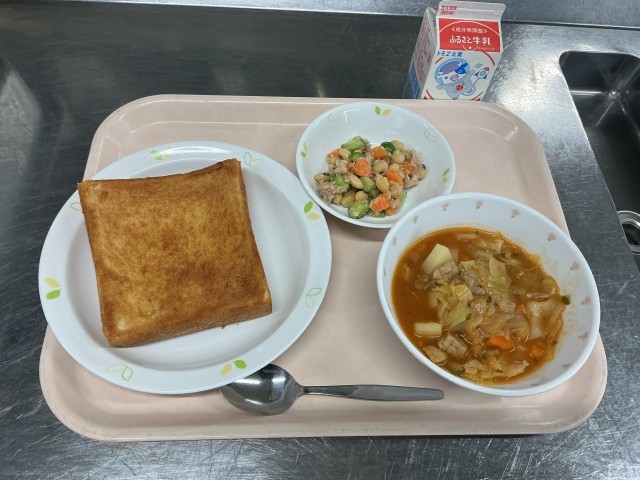 本日の献立 シナモントースト 牛乳 ボルシチ ビーンズサラダ