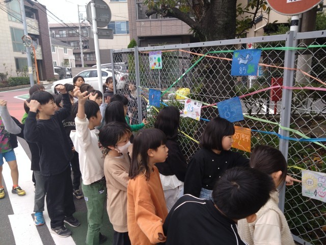校舎のまわりをぐるっと囲むお祝いのフラッグ。