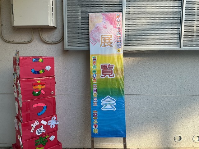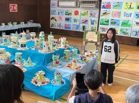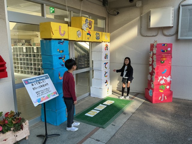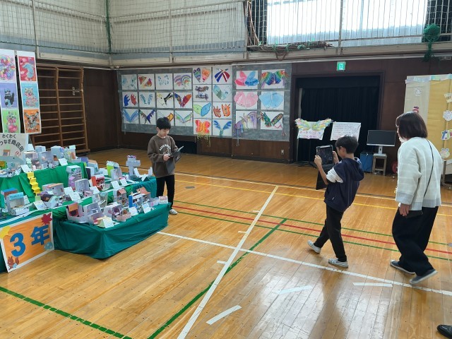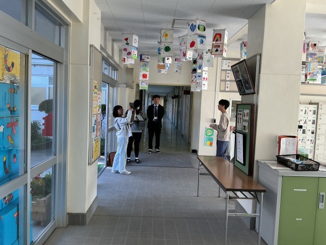 次に、放送室、体育館、正面玄関で中継を行い、各学年の作品や全校装飾作品などを紹介しました。