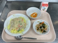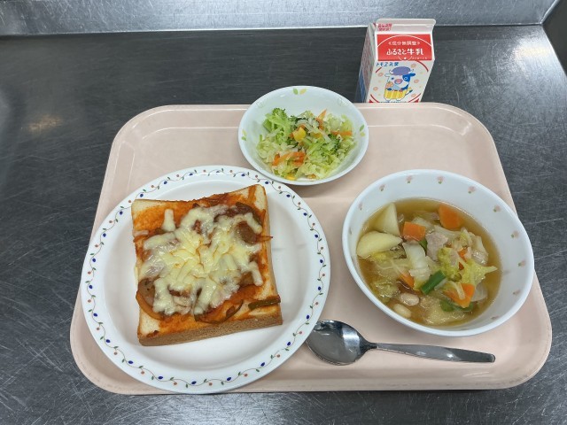本日の献立 ピザトースト 牛乳 野菜のドレッシングかけ 白いんげんの田舎風スープ
