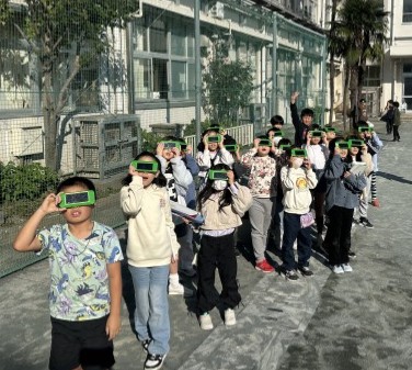 理科の学習では、遮光板を使って太陽の観察をしました。普段、強い光に包まれているため直視できない太陽も、遮光板があれば安心して観察することができます。子どもたちが太陽に向かって遮光板を構えたナイスタイミングで撮影できました。