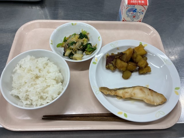 本日の献立 ごはん 牛乳 魚の西京焼き きのこ入りおひたし さつまいもの甘辛煮