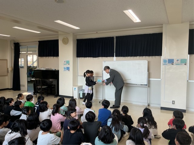 学校の代表である校長先生に見ていただきたいと、校長先生への贈呈式を行いました。