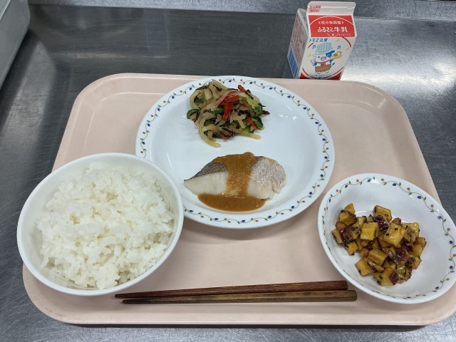 本日の献立 ごはん 牛乳 魚のピリ辛ソースかけ 大根とひじきのおかかあえ お豆かりんとう