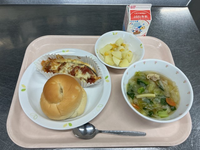 本日の献立 パインパン 牛乳 魚のピザ風 コーンポテト 野菜スープ