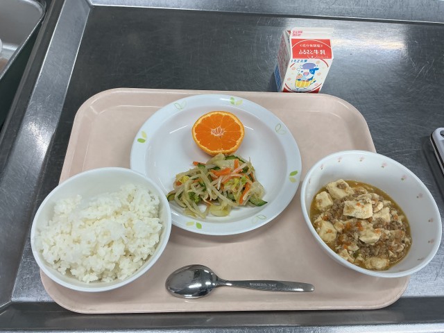 本日の献立 ごはん 牛乳 麻婆豆腐 白菜の中華サラダ 菊花みかん