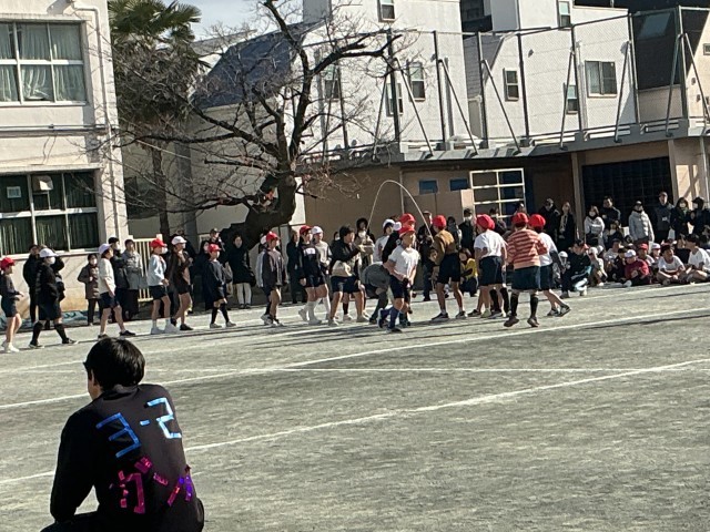この時のために、休み時間を使って各クラスで練習を重ねてきました。12月の始めの記録からどれくらい回数を伸ばせるか。子供たちも考えてきました。跳ぶ速さは人それぞれなので、どのような順番で並んで跳べば良いのか、それに合わせる速さはどうしたら良いか。