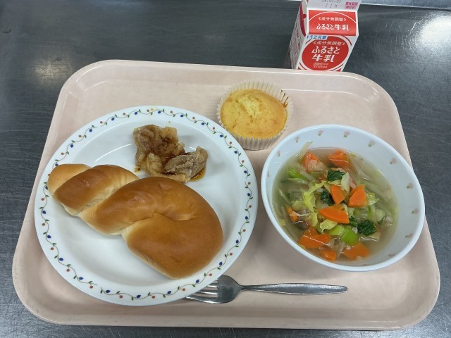 本日の献立 〜年末お楽しみ献立〜 ミルクパン 牛乳 鶏肉のマーマレードソース ベーコンと野菜のスープ パウンドケーキ
