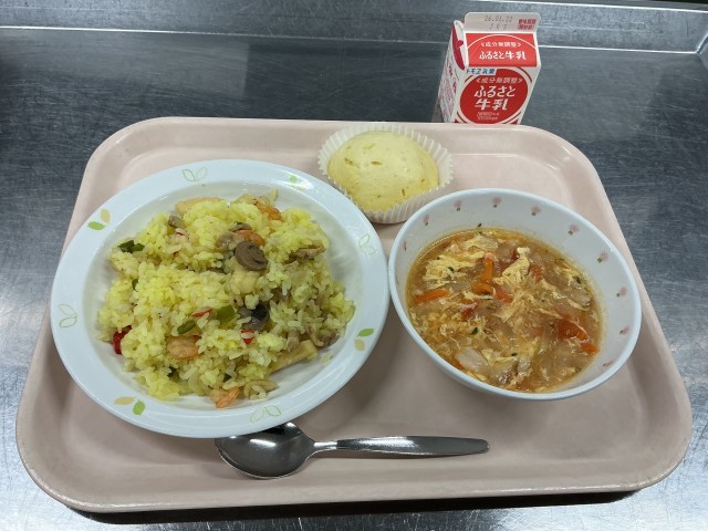 本日の献立 パエリア 牛乳 卵スープ パイン入り蒸しケーキ