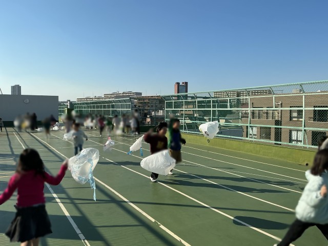 生活科の授業で「昔のあそび」をしました。たこ上げではビニール袋を使用し、それぞれのオリジナルたこを作りました。自分で作ったたこや、さまざまな昔の遊びに親しみ、満足そうな表情で活動する子どもたちの姿が見られました。