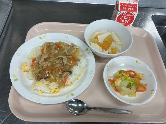 本日の献立 あんかけチャーハン 牛乳 辣白菜 杏仁豆腐