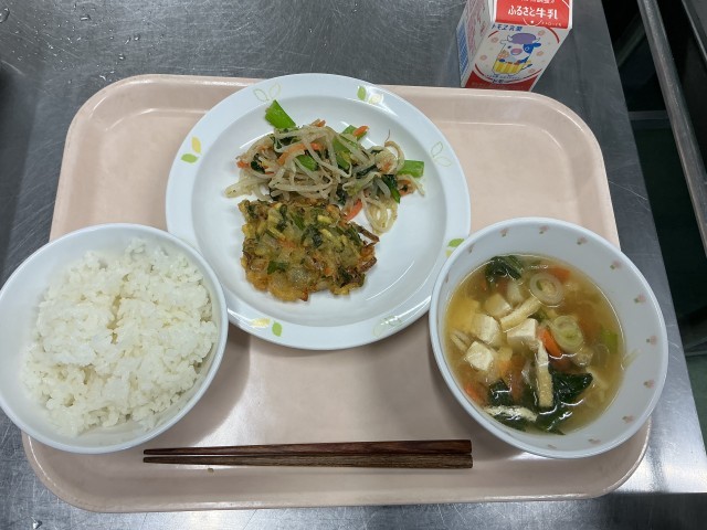 本日の献立 ごはん 牛乳 かきあげ 野菜のごまあえ 吉野汁