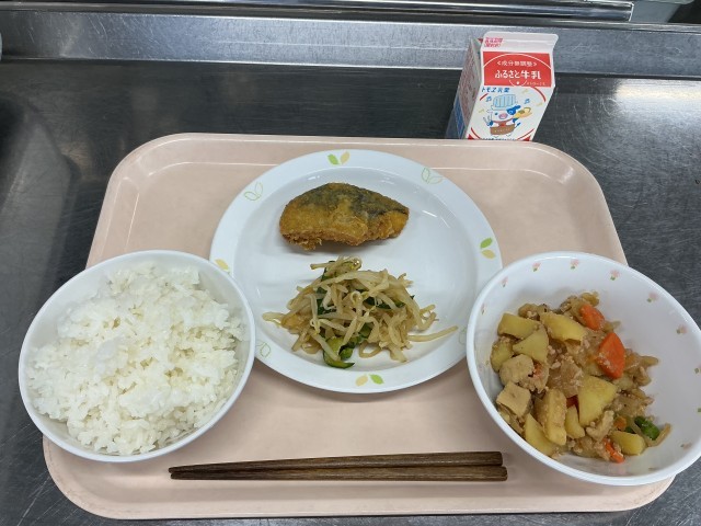 本日の献立 ごはん 牛乳 魚のカレーあげ もやしときゅうりのごま風味 じゃがいものそぼろ煮