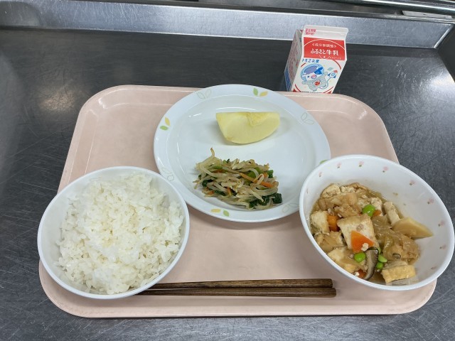 本日の献立 ごはん 牛乳 生揚げそぼろあんかけ 野菜のからしじょうゆかけ りんご