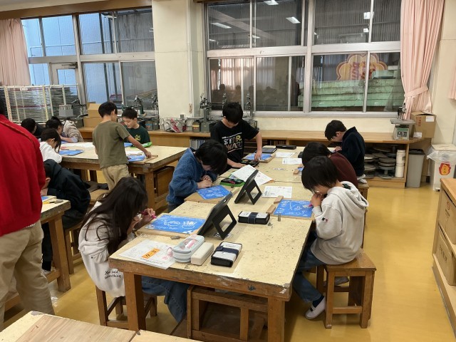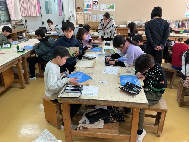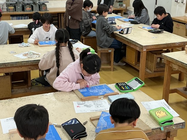 4年生は彫刻刀を用いた木版画に挑戦しています。