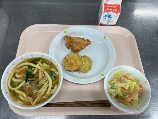 本日の献立 カレーうどん 牛乳 天ぷら(さつまいも )とり天 野菜のごま風味