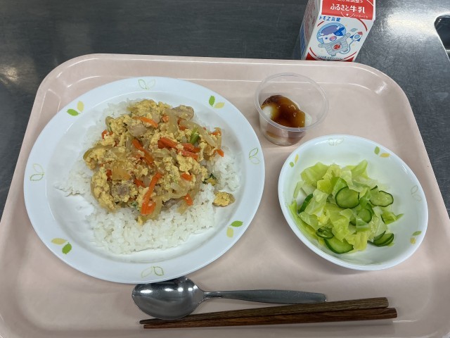 本日の献立 親子丼 牛乳 野菜のひとしお 白玉だんご(みたらし)