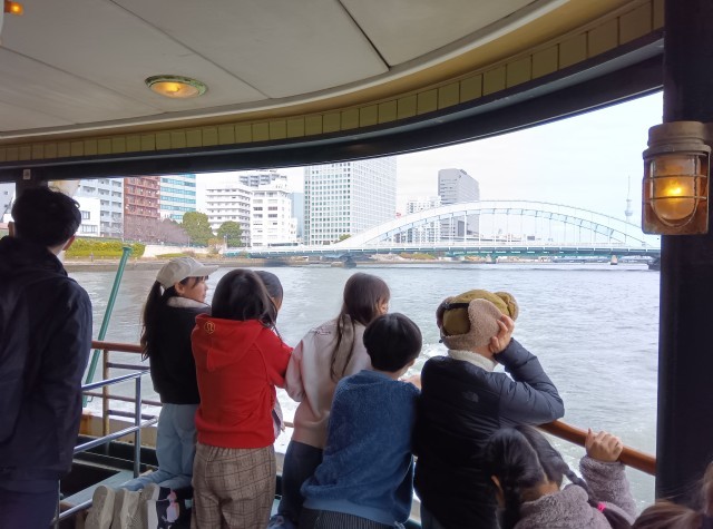 隅田川沿いのたくさんの橋をくぐりながら東京湾に出てきました。席は、天井を含めガラス張りで眺望は最高です。順番に後部デッキに出て、海風を感じながら気持ちよさそうに外の景色を楽しんでいます。