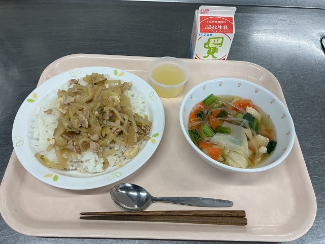本日の献立 豚丼 牛乳 ワンタンスープ りんごゼリー