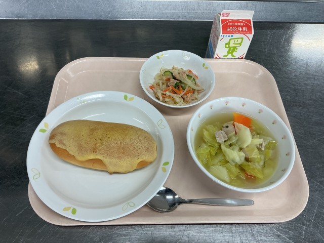 本日の献立 ビスキュイパン 牛乳 ポトフ もやしとツナのサラダ