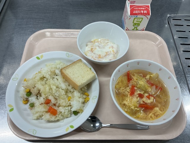 本日の献立 三色ピラフ 牛乳 アクアコッタ フルーツヨーグルト