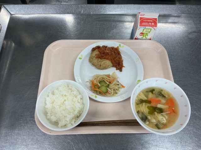 本日の献立 ごはん(有機米) 牛乳 豆腐入りハンバーグ こんにゃくサラダ みそ汁