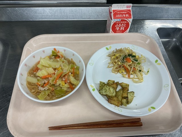 本日の献立 みそラーメン 牛乳 青のりフライドポテト ナムル