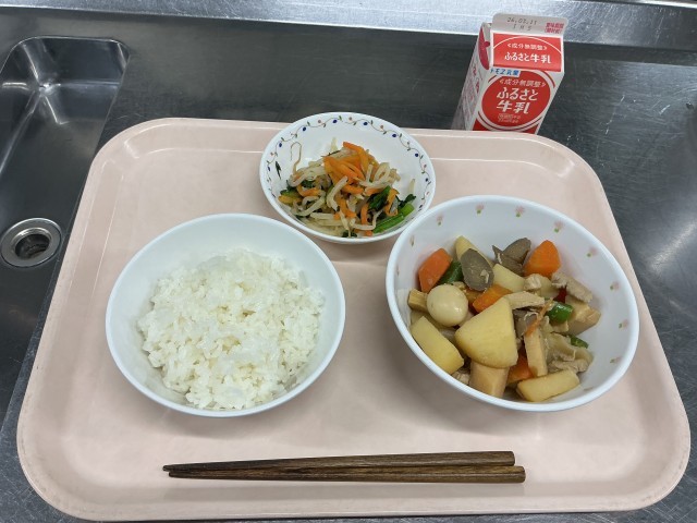 本日の献立 ごはん 牛乳 鶏肉とじゃがいものうま煮 青菜ののりあえ
