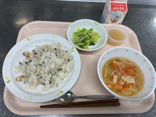 本日の献立 ひなまつり献立 鮭のあけぼのずし 牛乳 野菜のごま風味 沢煮椀 もものゼリー