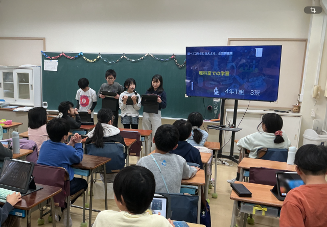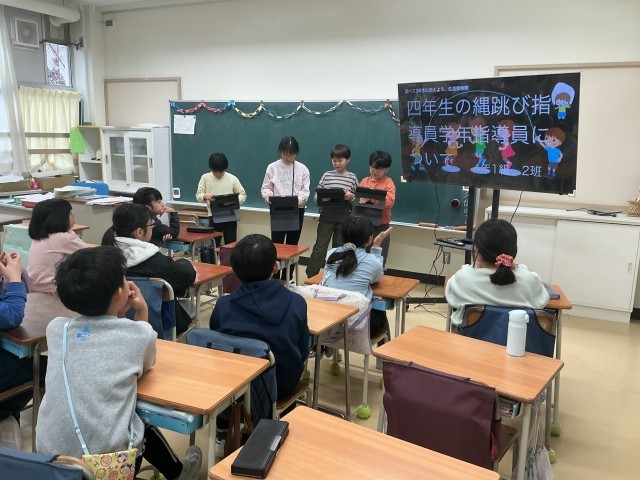 4年生で行った校外学習やもうすぐ始まるクラブ活動、縄跳び指導員などについてなどアンケートやインタビューしたことをスライドにまとめ、3年生に発表しました。