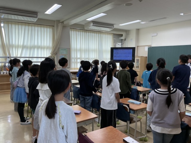 水曜日の朝は、音楽朝会がありました。全校児童が視聴する動画に4年生が出演し、校歌をすてきに歌うコツを伝授してくれました!