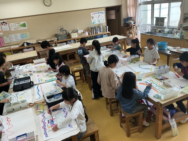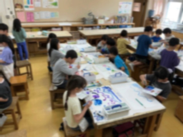 今回は絵の具と水の量、筆の使い方を学び、自分の色や筆の動かし方を工夫して大きな紙に表しました