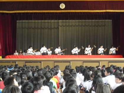 5月22日(水)の音楽集会では,ひなどりの会に入っている子どもたち17名が,三味線と唄を演奏してくれました。三味線のすてきな響きに,綺麗な唄を合わせて「うさぎ」「ふるさと」などの曲を演奏しました。
